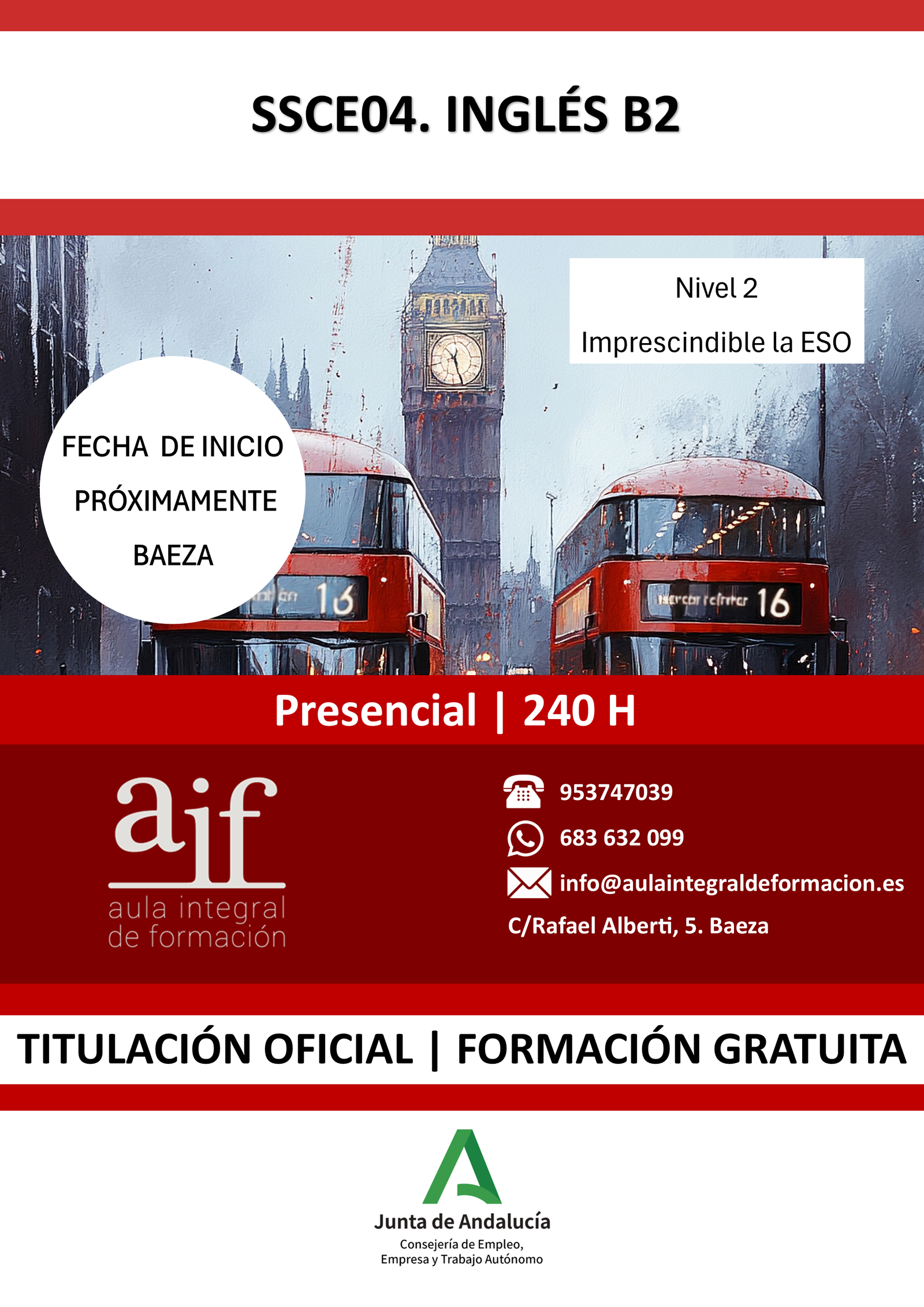 Los datos personales solicitados a través de este formulario son los mínimos necesarios para atender su solicitud y serán tratados por AULA INTEGRAL DE FORMACIÓN S.L, NIF B23465594, domicilio en C/ Rafael Alberti, 5, - 23440 - Baeza - Jaén, de acuerdo a lo establecido en nuestra POLÍTICA DE PRIVACIDAD. Los datos recabados por este formulario no se cederán a terceros salvo por obligación legal.